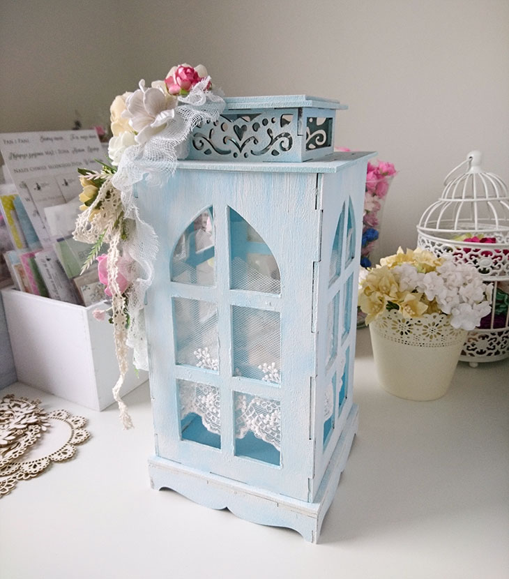 Latarenka od Agaterii jest dość sporych rozmiarów. Miałam ją ozdobić na święta, zimowo, a w środku ułożyć lampki. Jednak z braku czasu przeniosłam ją na wiosnę co wg mnie było równie dobrym pomysłem.