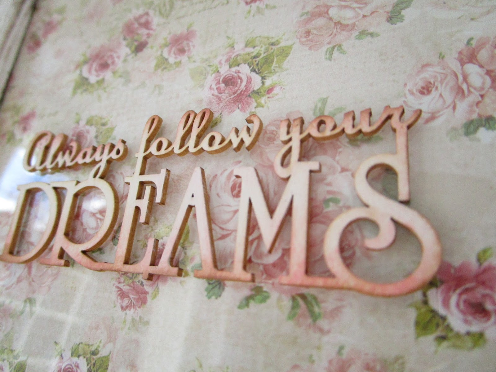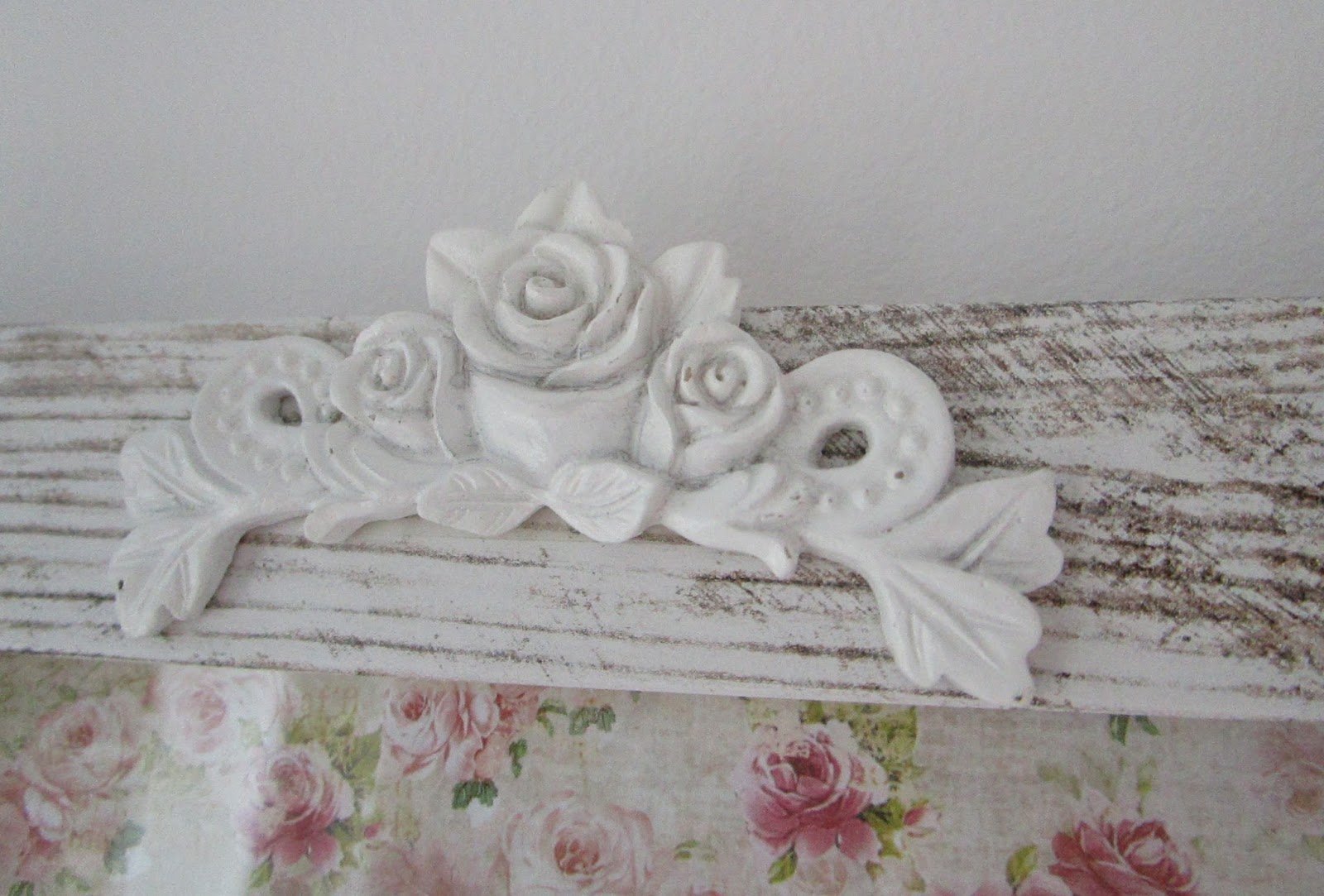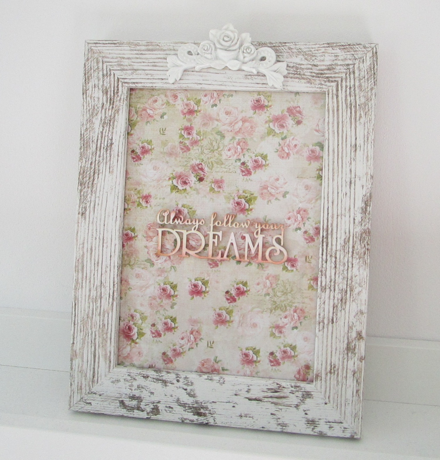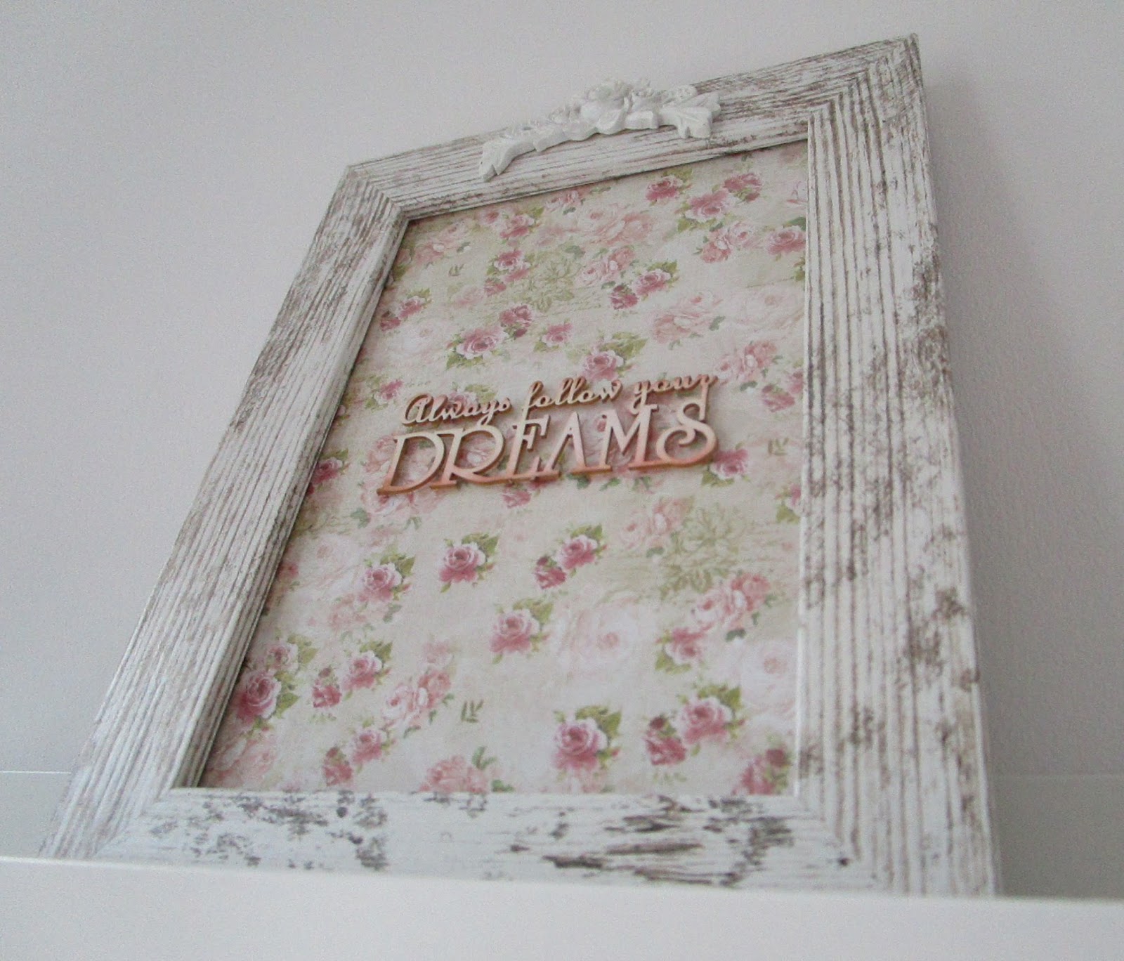 Ramki na zdjęcia już nie są tylko na zdjęcia. Mogą mieścić w sobie np. jakieś przesłanie czy hasło, o którym warto sobie codziennie przypominać. Moją ramkę kupiłam w Empiku, mimo że nie jest drewniana bardzo wiarygodnie imituje efekt przetartego, zużytego drewna, czyli właśnie shabby chic. W połączeniu z tym stylem bardzo mi się podobają motywy kwiatowe, tutaj wykorzystałam papier do scrapbooking’u w róże. Mały dekor u góry i hasło, które pocieniowałam różowym tuszem dopełniają całości.