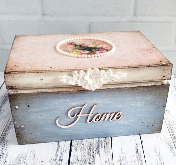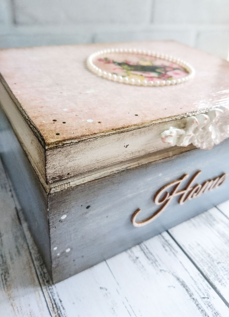 A tak prezentuje się pudełko po ostatecznych szlifach: dodałam kolor na dole, postarzyłam bitumem i przykleiłam małe dekoracje