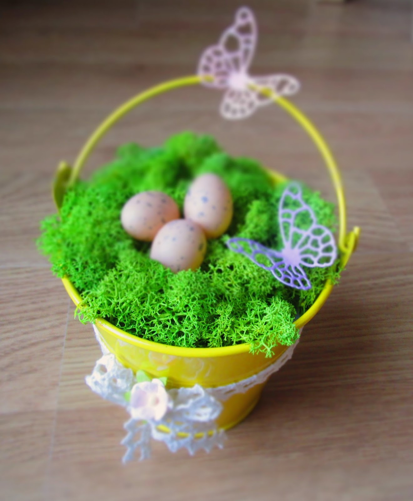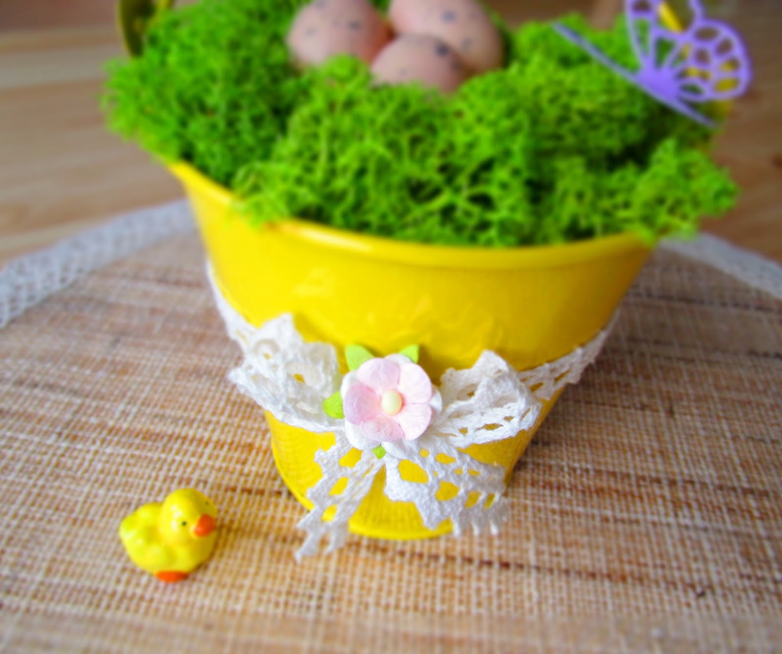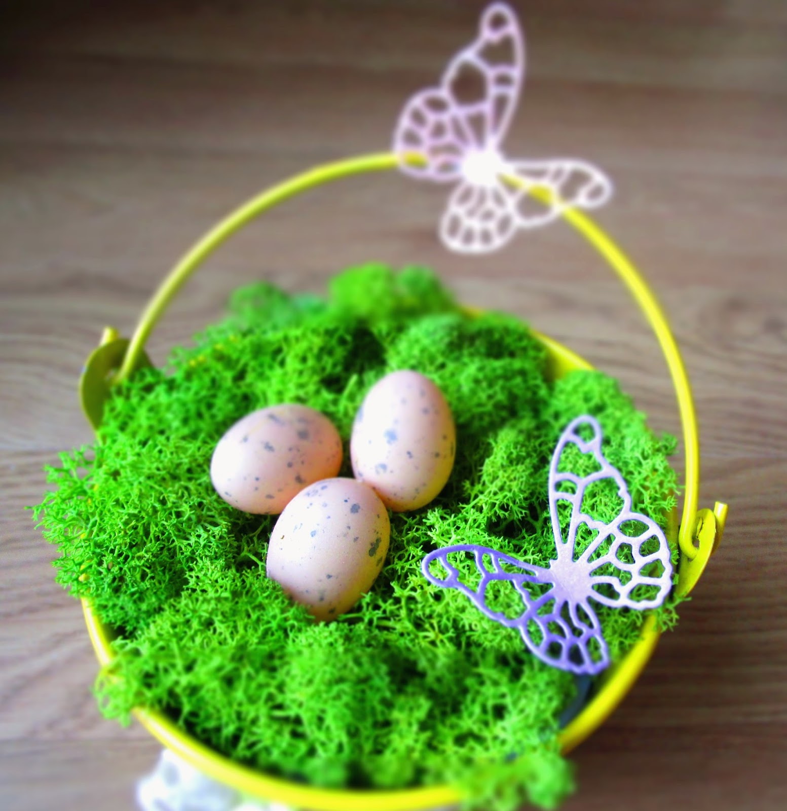 Do stworzenia dekoracji na Wielkanoc zachęcił mnie post na blogu sklepu ZieloneKoty. Odgruzowałam więc wiaderko, które w poprzednich latach było domem dla kilku kwiatków, wybrałam się na zakupy materiałów wielkanocnych, które sklep ma w swojej ofercie i się zaczęło. Chciałam, żeby efekt końcowy nie raził po oczach mnogością drobiazgów. Miało być lekko, soczyście i wiosennie-wielkanocno.
